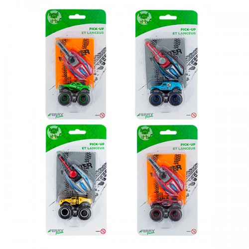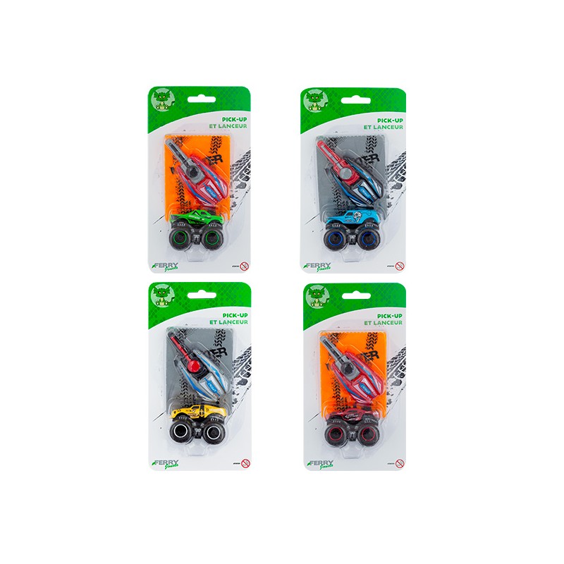 1 pick up metal roues libres, 1 lanceur clé et 1 tremplin. Pick-up en métal à roues libres avec tremplin et lanceur pour réaliser des sauts impressionnants et vivre des défis explosifs.