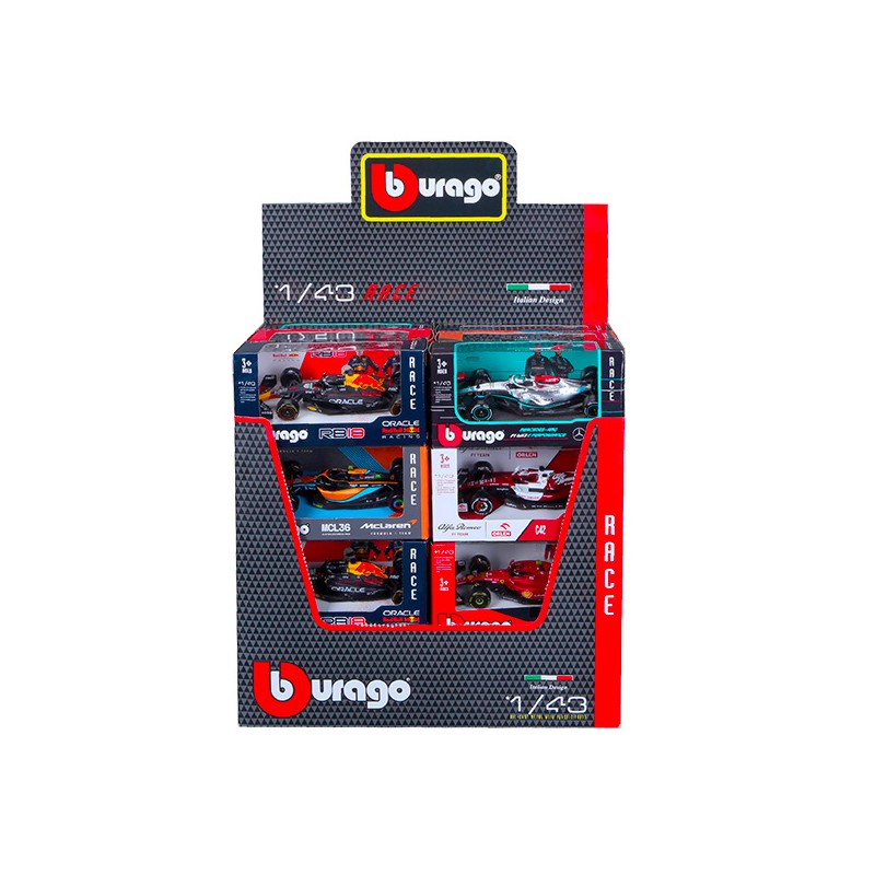 Assortiment véhicules Formule 1 saison 2023 de 6 écuries et 12 pilotes en métal à l ’échelle 1/43ème. Ecuries Ferrari, RedBull, McLaren, Mercedes et Alpha Romeo. Age : 3a+