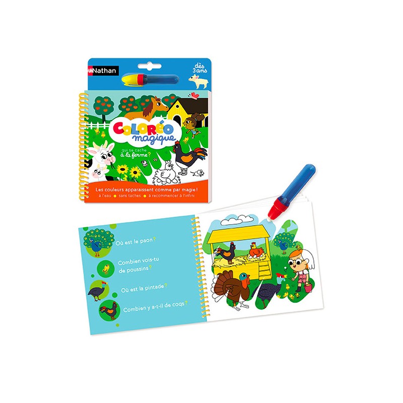 Colorier c’est magique avec Coloréo ! L’enfant colorie avec le stylo à eau pour faire apparaitre les couleurs des jolies illustrations de la ferme. Age : 3a+