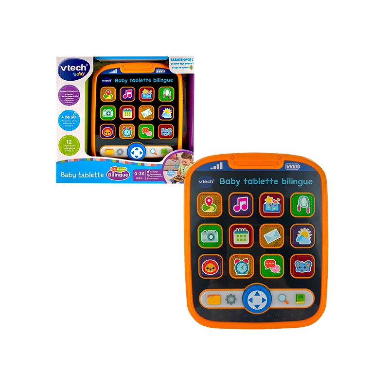Baby tablette bilingue - 9 - 36 mois Une tablette bilingue français/anglais riche en apprentissages ! Conçue pour les tout-petits, cette tablette possède 12 boutons lumineux pour faire le plein d’apprentissages : GPS, Animaux (Lion, éléphant)