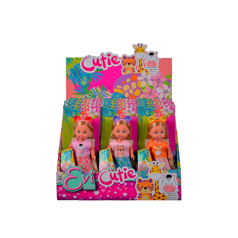 Poupée Evi 12 cm habillée à l’effigie d’un animal trop mignon de la savane : la girafe, le tigre et le zèbre ainsi qu’un serre-tête - 3 poupées assorties dans un présentoir de comptoir 12 pièces.