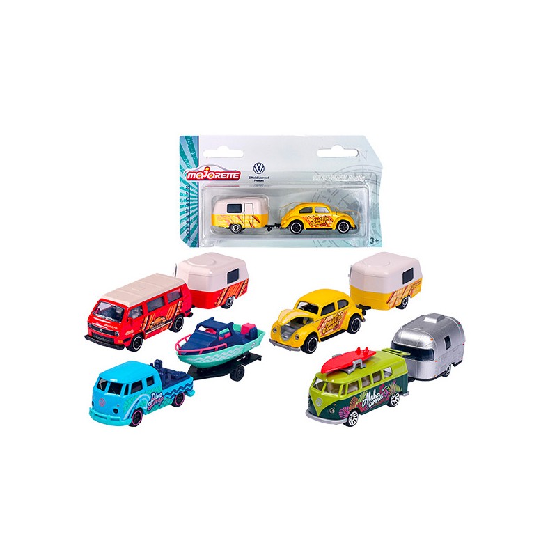 Collection Vintage Majorette. Véhicule + remorque en métal à l'échelle 1/64ème. Reproduction fidèle des grands modèles Volkswagen. Fonctions de jeu : parties ouvrantes ou parties mobiles, phares translucides, suspensions.