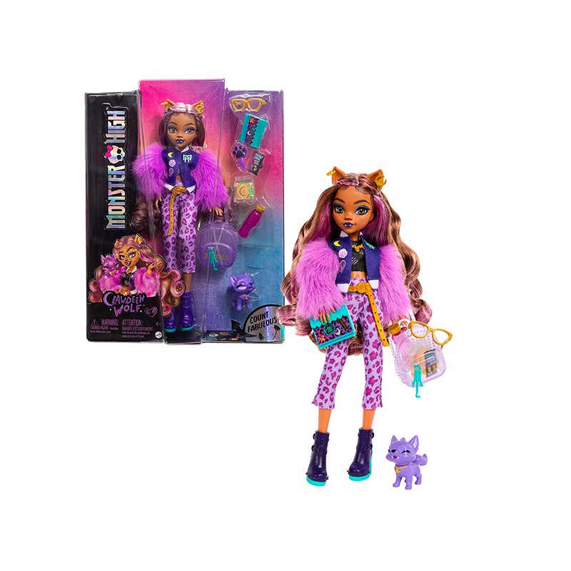 En blouson à manches en fourrure et legging léopard, cette fille de loup-garou ne passe pas inaperçue. La poupée est incluse avec 7 accessoires et 1 chat.