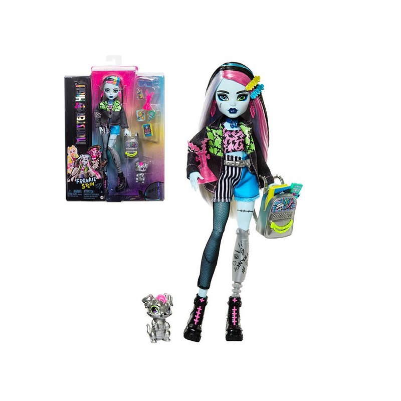La poupée articulée porte de longs cheveux, une longue veste sur un short, une prothèse à la jambe et 7 accessoires. Son chiot ne la quitte jamais. Age : 4a+