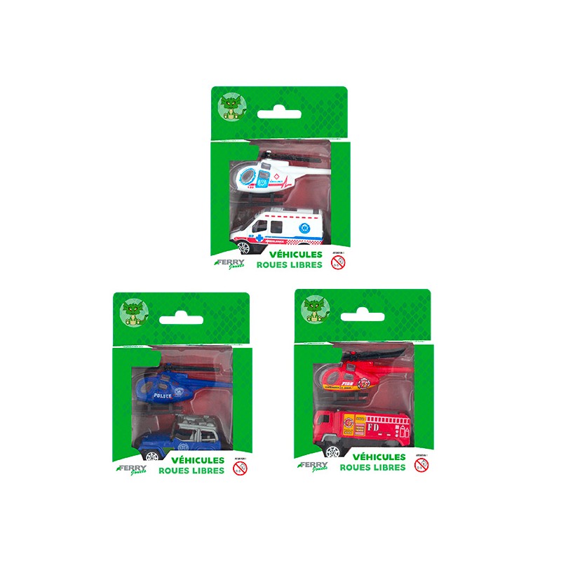 3 modèles assortis : 1 véhicule de police + 1 hélicoptère, 1 camion de pompier + 1 hélicoptère, 1 ambulance + 1 hélicoptère. 2 véhicules en métal à roues libres pour doubler le fun et imaginer encore plus daventures sur la route.