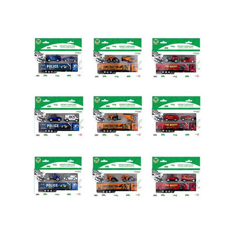 9 modèles assortis : 3 modèles travaux publics (2 véhicules + 1 camion), 3 modèles police (2 véhicules + 1 camion), 3 modèles pompier (2 véhicules + 1 camion).