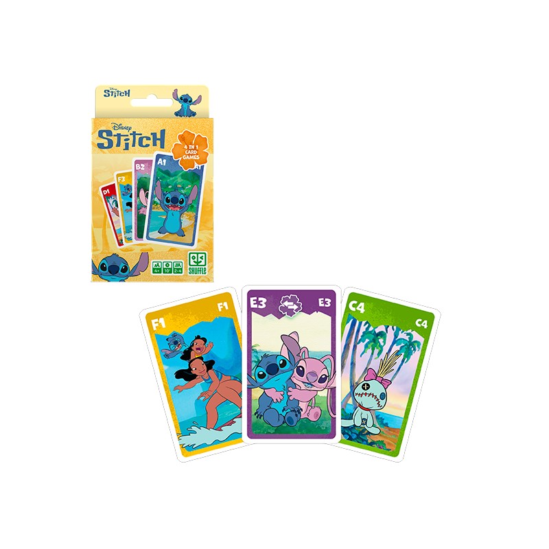 Joue avec ce jeu de cartes 4en1 Stitch et l’ensemble des personnages dans un univers coloré : un jeu de 7 familles, un jeu d’action, un jeu de mémo ou encore un jeu de batailles Age : 4 ans