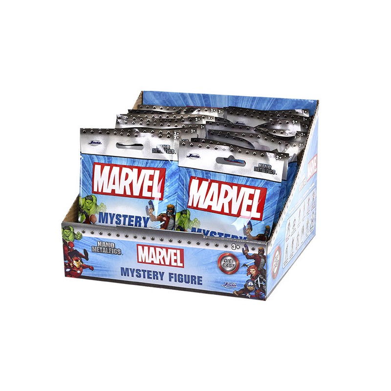 Figurines en métal de 4cm en blind pack dans un display de 24 pièces. 12 modèles différents. Les figurines représentent les personnages de Marvel tels que Spider-Man, Iron-Man, Captain America, Hulk... Sous licence officielle Marvel.