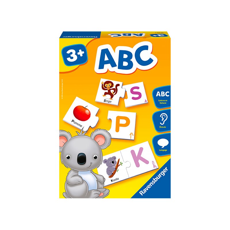 Avec ces 28 paires de cartes-puzzles autocorrectives, l'enfant joue à associer chaque lettre à l'initiale d'un mot, et à des graphies différentes : minuscule/majuscule, script/cursive. Ce jeu favorise ainsi l'écoute et l'apprentissage de l'alphabet.