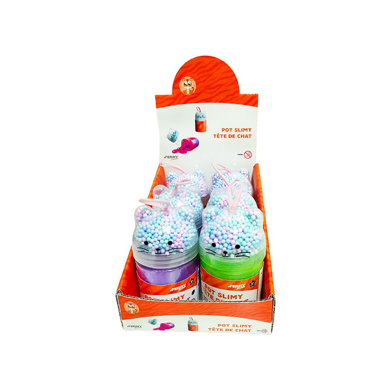 1 pot slimy tête de chat de 170gr en display de 6. Pot de slimy tête de chat pour samuser avec une pâte gluante et colorée qui stimule la créativité et la détente.