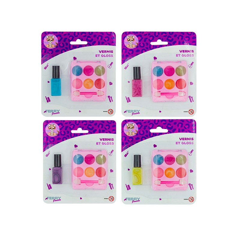 1 vernis et 1 palette gloss de 6 couleurs + 1 pinceau. Vernis et gloss assortis pour briller jusquau bout des ongles et des lèvres avec des couleurs fun et pétillantes.