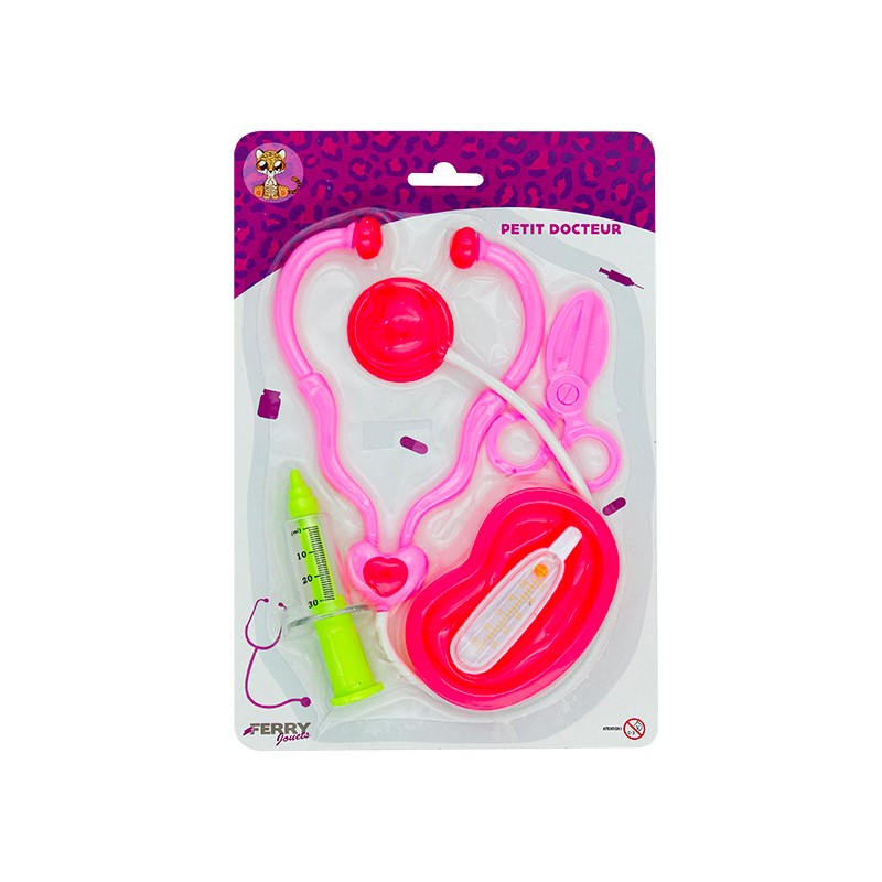 Ce kit contient : 1 stétoscope, 1 thermomètre, 1 seringue, 1 ciseau, 1 haricot. Petit docteur avec tous les accessoires pour soigner les bobos, écouter le coeur et faire comme un vrai médecin en jouant.