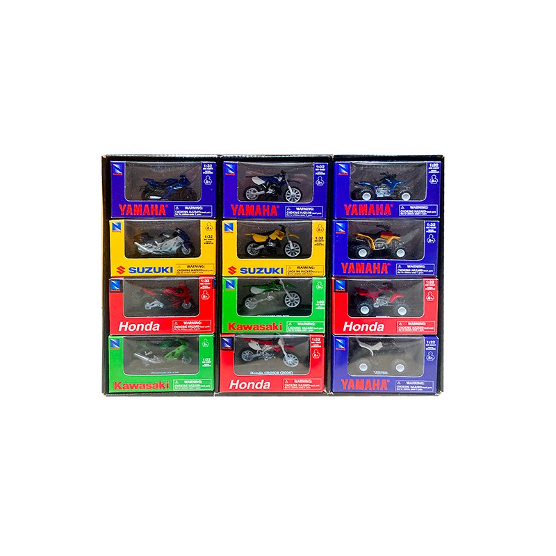Assortiment 12 pièces Die-Cast avec 4 motos cross, 4 motos route et 4 quads. Livrés en boite individuelles dans un présentoir de 24 pièces. Fidèles répliques des modèles de marques Honda, Yamaha, Suzuki et Kawasaki.