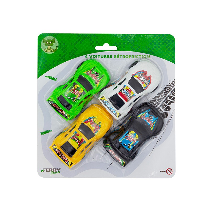 Set de 4 voitures de rallye à rétrofriction pour organiser des courses spectaculaires et repousser les limites de la vitesse.