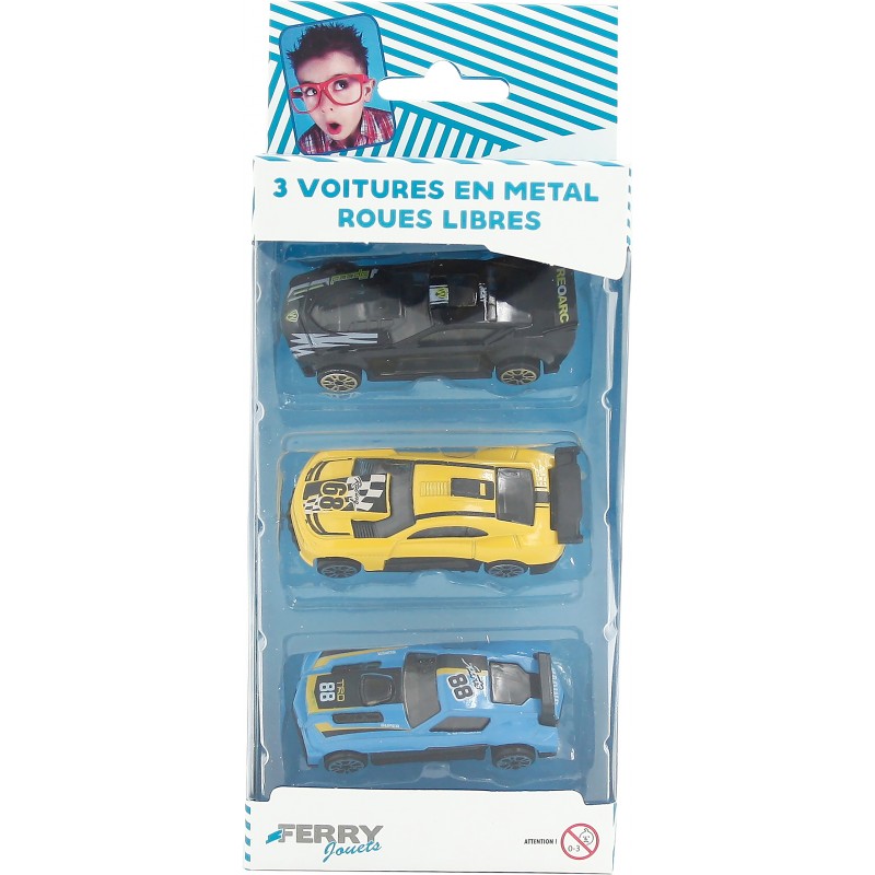 2 modèles assortis : 3 modèles de voitures par boite. Set de 3 voitures en métal à roues libres pour des courses effrénées et des heures de jeu pleines de vitesse et dimagination.