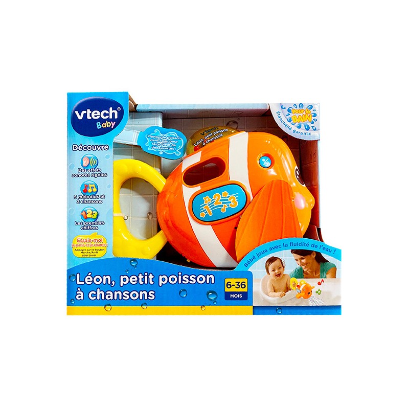 Un petit poisson musical et parlant pour jouer dans le bain. Une nageoire avec des effets lumineux. Un gros bouton 1 2 3 pour découvrir les premiers chiffres. Bébé peut verser de l'eau dans le ventre du poisson.