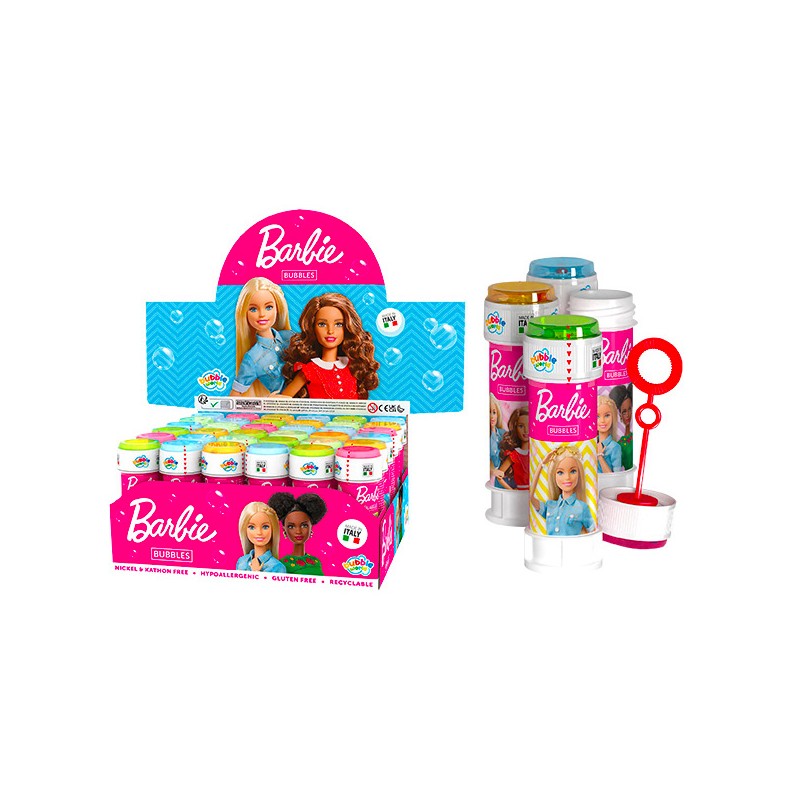1 flacon de 60 ml de bulles de savon en display de 36 décoré Barbie. Pour créer des bulles colorées et magiques lors de moments de jeu en plein air.
