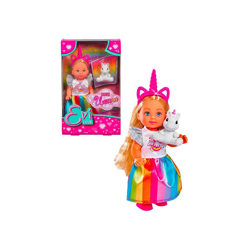 Mini poupée mannequin Evi 12cm. Evi porte une robe licorne multicolore, un serre-tête licorne et est accompagnée d'une petite licorne.