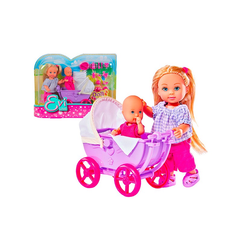 La poupée Evi Love de 12 cm promène le bébé dans son landau. Elle dispose de nombreux accessoires indispensables à toute sortie avec un bébé : landau, biberons, jouets... 2 versions assorties.