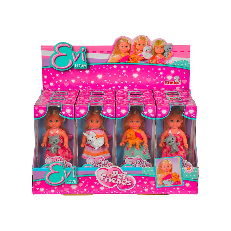 Poupée Evi 12 cm avec un petit animal de compagnie. 3 poupées assorties. Chacune dans une tenue différente avec un animal différent : un chien, un lapin ou un chat. 3 modèles assortis dans un présentoir de comptoir 12 pièces.