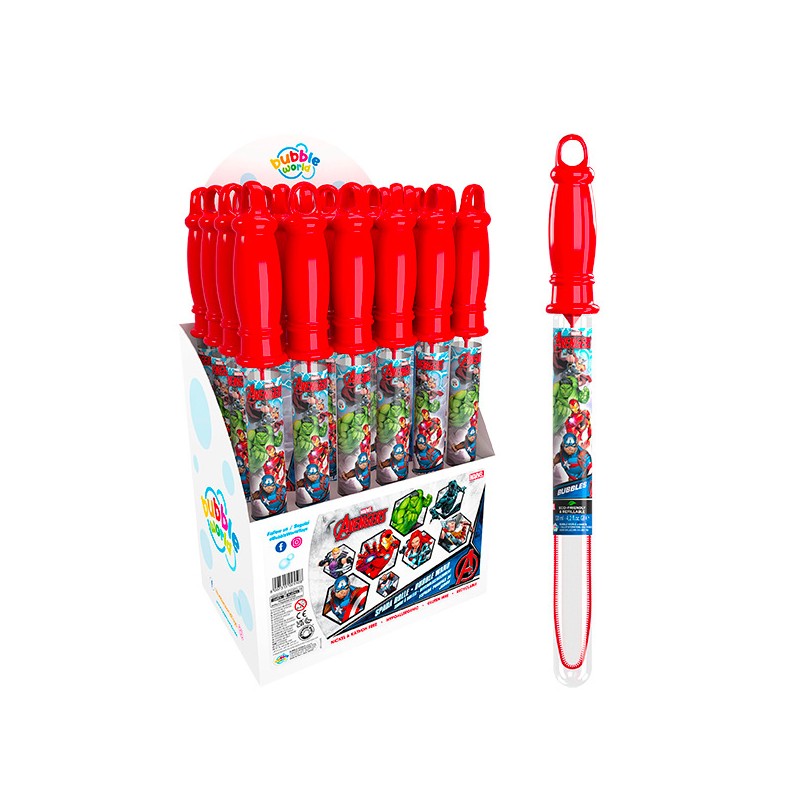 1 sabre de 120 ml de bulles de savon en display de 24 décoré Avengers. Pour créer des bulles colorées et magiques lors de moments de jeu en plein air.