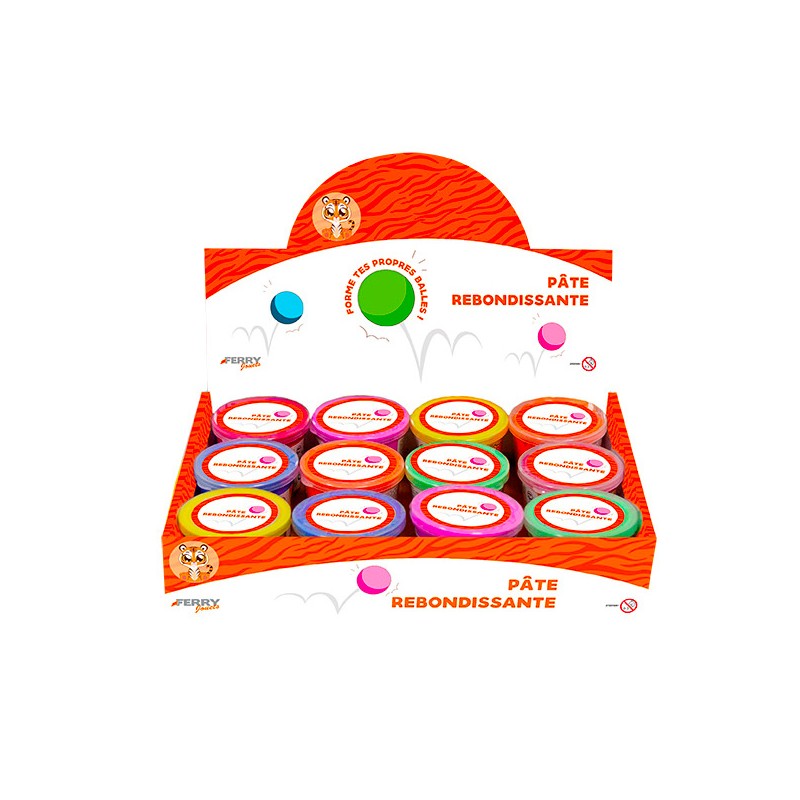 1 pot de pâte rebondissante en display de 12. Pot de pâte rebondissante pour samuser à manipuler une matière élastique et vive, idéale pour le jeu et la détente.