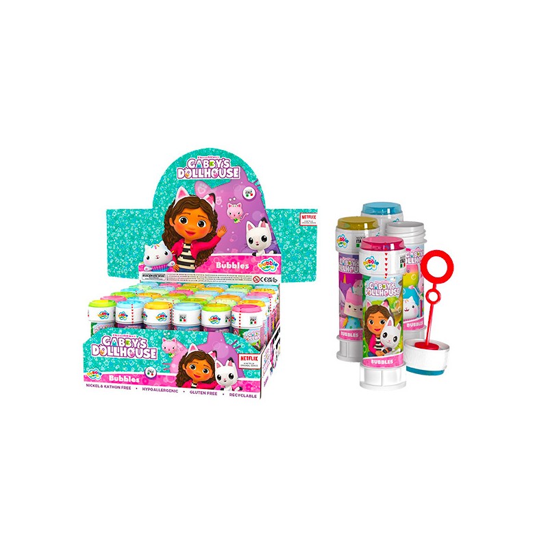 1 flacon de 60 ml de bulles de savon en display de 36 décoré Gabby. Pour créer des bulles colorées et magiques lors de moments de jeu en plein air.