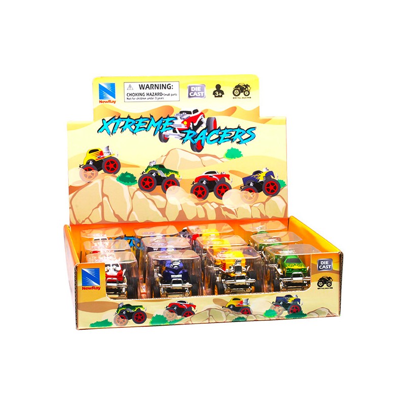 Mini buggy Die-cast à friction, 4 modèles assortis, livrés en boite individuelle dans un présentoir de 12 pièces.