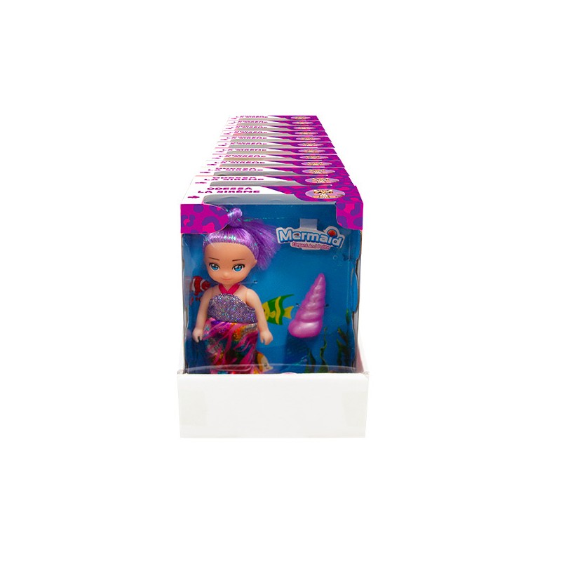 1 poupée en display de 12, 2 modèles assortis : 1 poupée avec un coquillage, 1 poupée avec une étoile de mer. Poupée Odessa sirène aux couleurs scintillantes pour explorer les fonds marins et inventer des histoires magiques sous locéan.
