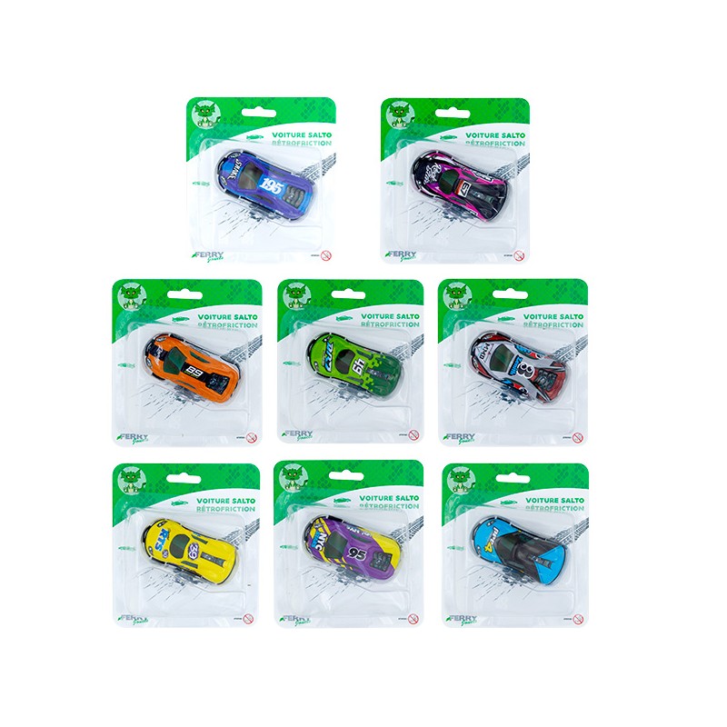 8 décors assortis. 1 voiture faisant des saltos quand elle touche un rebord. Voiture en métal à rétrofriction avec effet salto pour des cascades spectaculaires et des courses pleines daction.