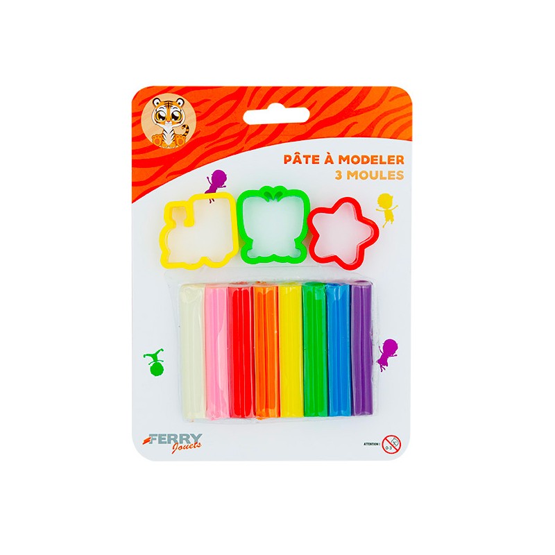 8 batons de pâte à modeler et 3 moules assortis. Pâte à modeler avec 8 bâtons de couleur et 3 moules pour créer des formes originales et samuser à modeler sans limite.