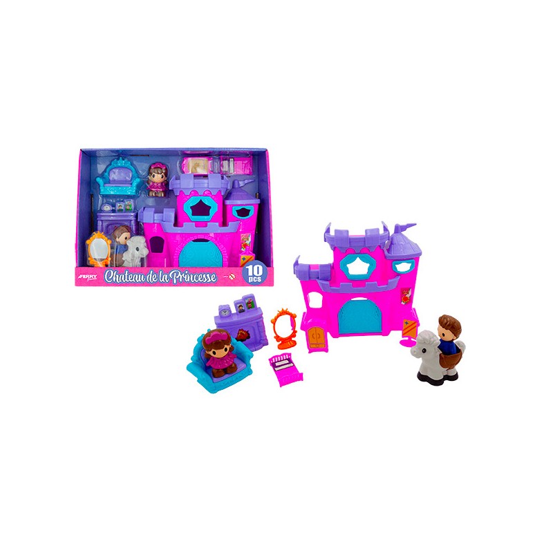 1 château avec 1 princesse, 1 chevalier, 1 poney et divers accessoires pour des aventures royales riches en fantaisie.