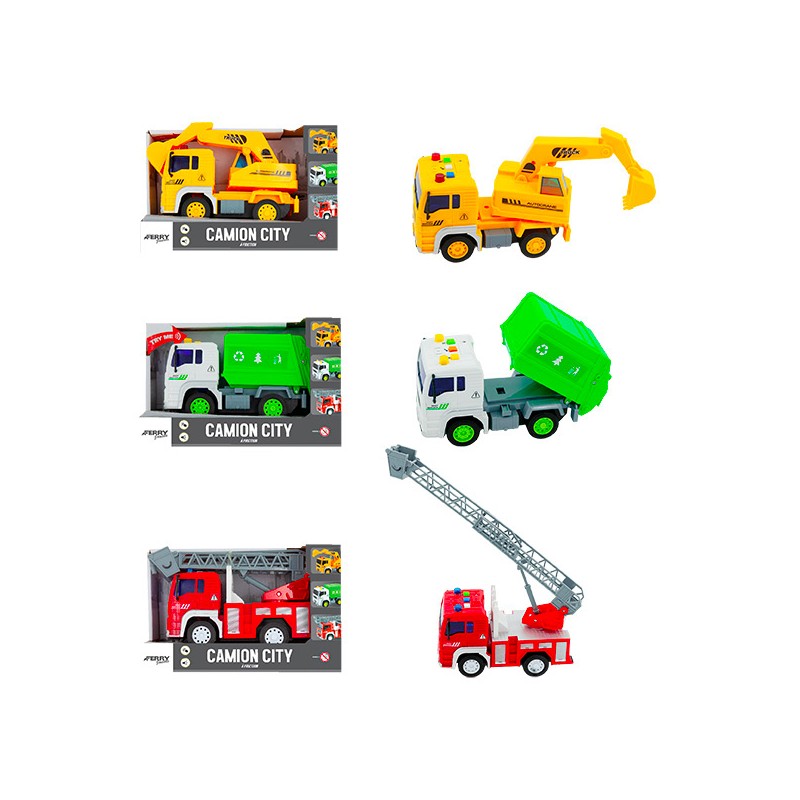 3 modèles assortis : pompier, travaux publics, camion benne. 1 camion 1:20 à friction sonore et lumineux. Pompier, chantier ou benne, chaque modèle avance à friction et sanime pour plus de réalisme.