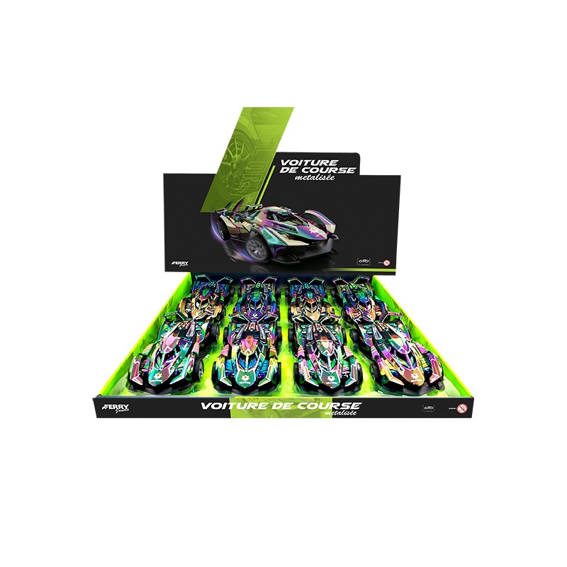 1 voiture de course métalisée à friction en display de 8. Cette voiture de course métallisée à friction est prête pour des drifts spectaculaires et des défis.