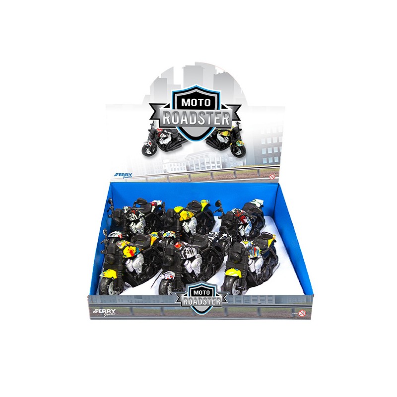 1 moto roadster à friction en display de 6. Cette moto roadster à friction file à toute allure et offre un look racé. Parfaite pour foncer vers de nouvelles aventures.